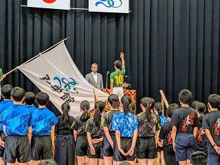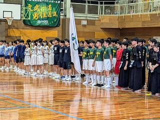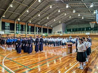 令和6年度の佐賀市中学校総合体育大会に向けて、6月17日に選手壮行会が行われました。各部主将による試合に向けての意気込み表明に続いて、学校長および中学生徒会長:太田悠花さんからの激励の言葉が述べられ、代表として中学サッカー部主将:兼田政継さんが力強い宣誓で応えました。各部の目標に向かって、試合では弘学館らしい粘り強い戦いを見せてくれるでしょう。
