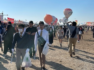 11/3(金)、5(日)の2日間、高校1・2年生の有志78名が、佐賀インターナショナルバルーンフェスタ2023会場内の清掃(ゴミ拾い)を行う環境ボランティアに参加しました。生徒たちは落ちているゴミを拾ったり、観客の方々のゴミを回収したりと積極的に会場内を動き回っていました。青空とバルーンを感じながらの楽しいボランティア活動となりました。