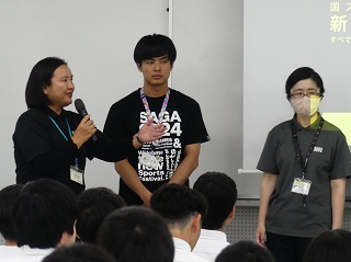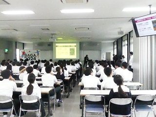 6月5日(月)、来年度、佐賀で開催される「国民スポーツ大会」「全国障害者スポーツ大会」、さらに「北部九州総体」の関係者が本校を訪れ、高校1年生を対象に、その紹介と同時にその魅力を伝えていただきました。各種目の有名選手からのメッセージも流れました。現高校1年生は来年度、様々な形で同大会に携わる学年であり、生徒は興味深く説明を聞いていました。