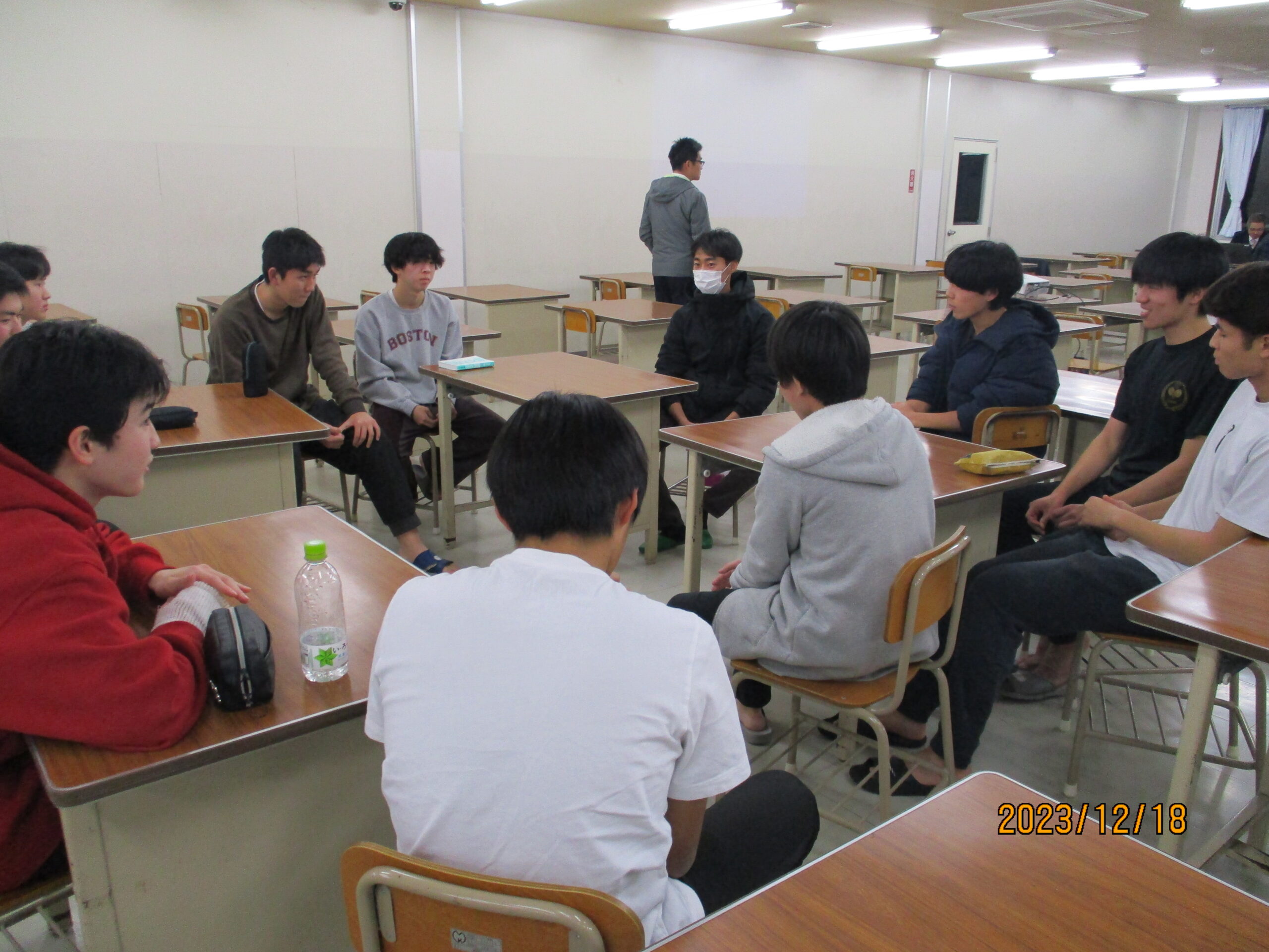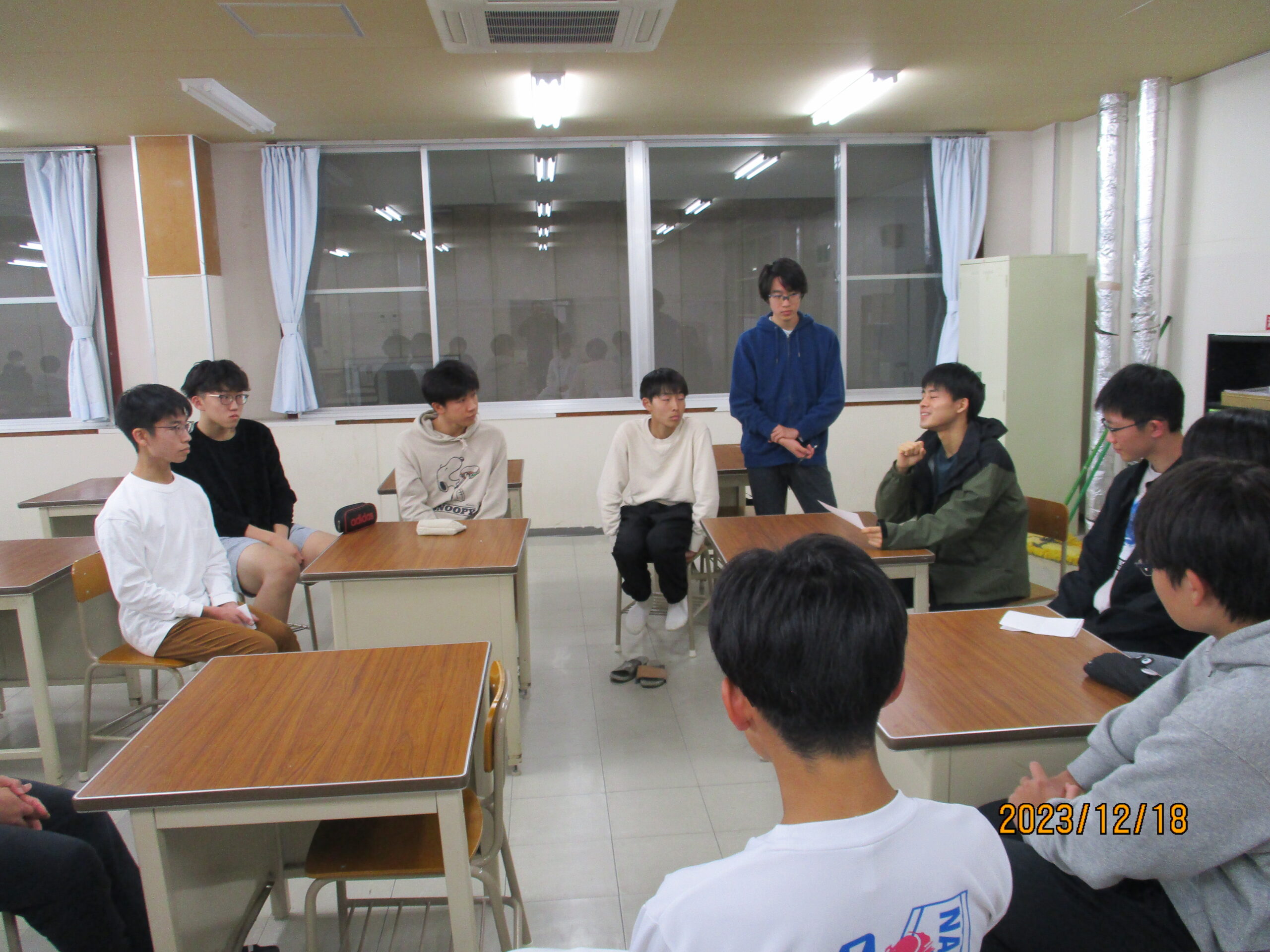 寮生に、難関大学に向けた話し合いの実施を呼びかけたところ、中学3年生 3名、高校1年生 18名、高校2年生 17名の申し込みがあり、12月18日、副校長や進学部長先生からの話、また、グループに分かれての話し合いには、佐賀医大生からのアドバイスがあるなど、盛んな意見交流会が行われました。