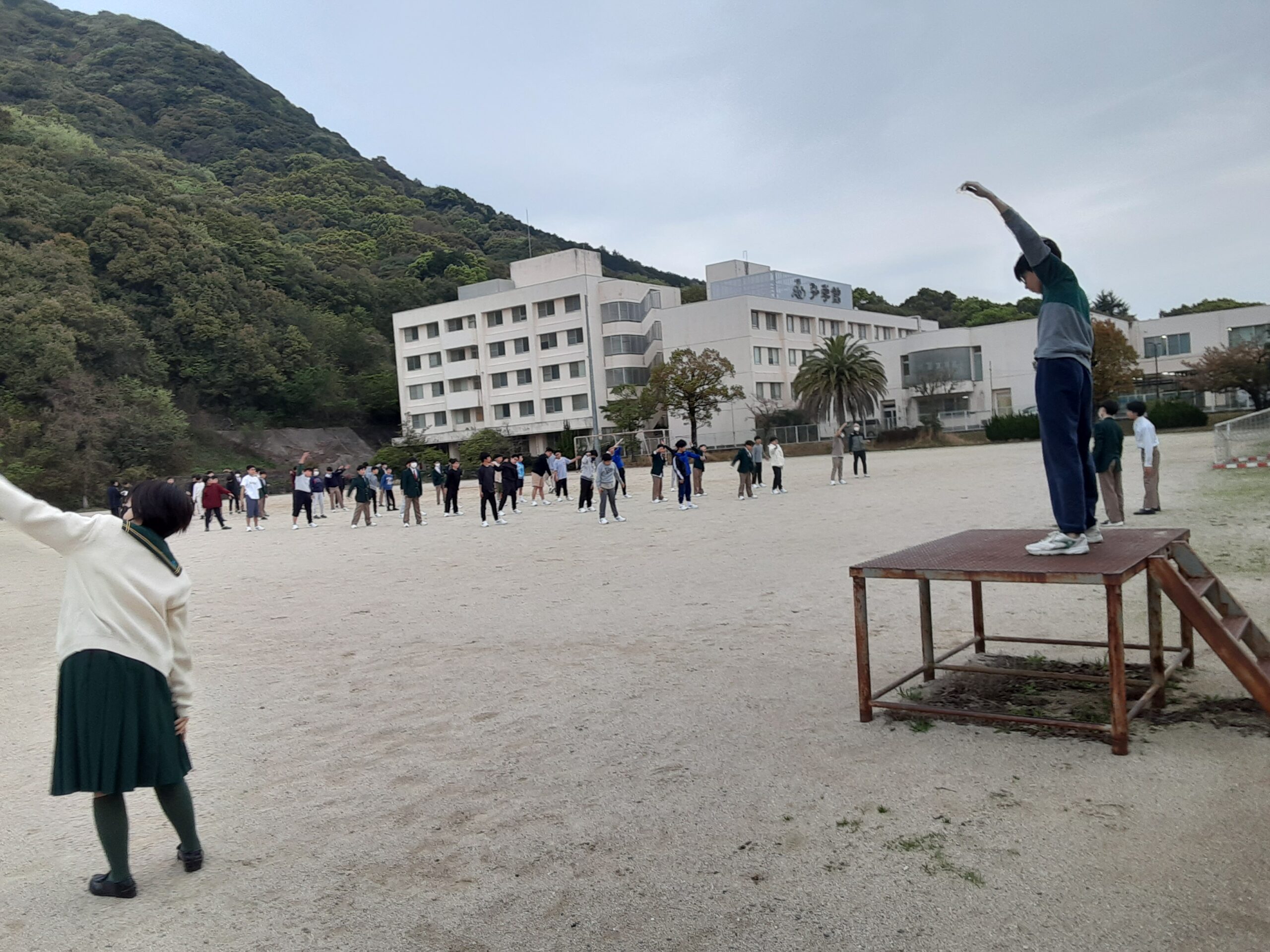 4月8日(月) 朝にグラウンドでラジオ体操をしました。心身ともに健康に注意しながら、寮生活を楽しく過ごしてほしいです。