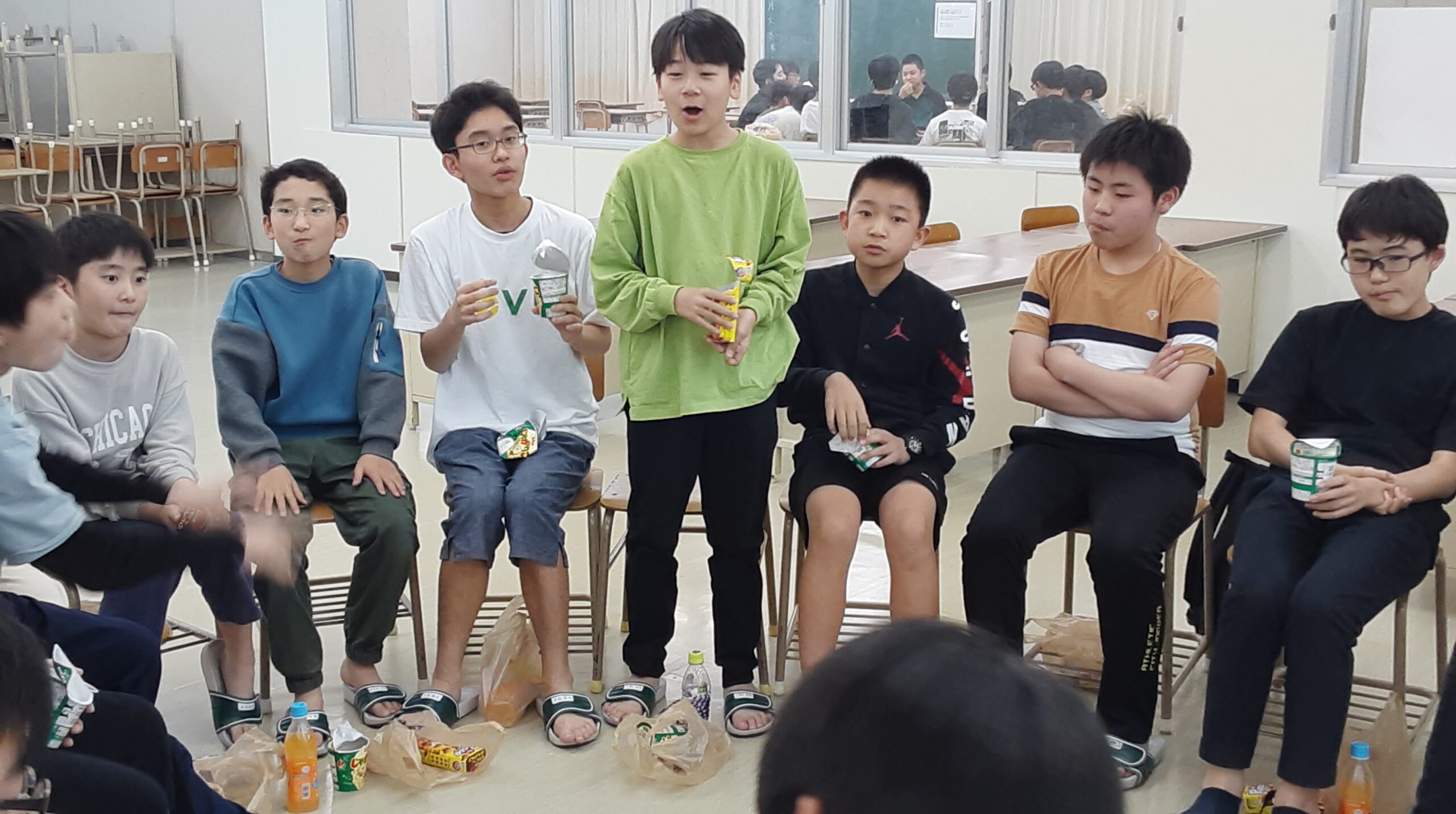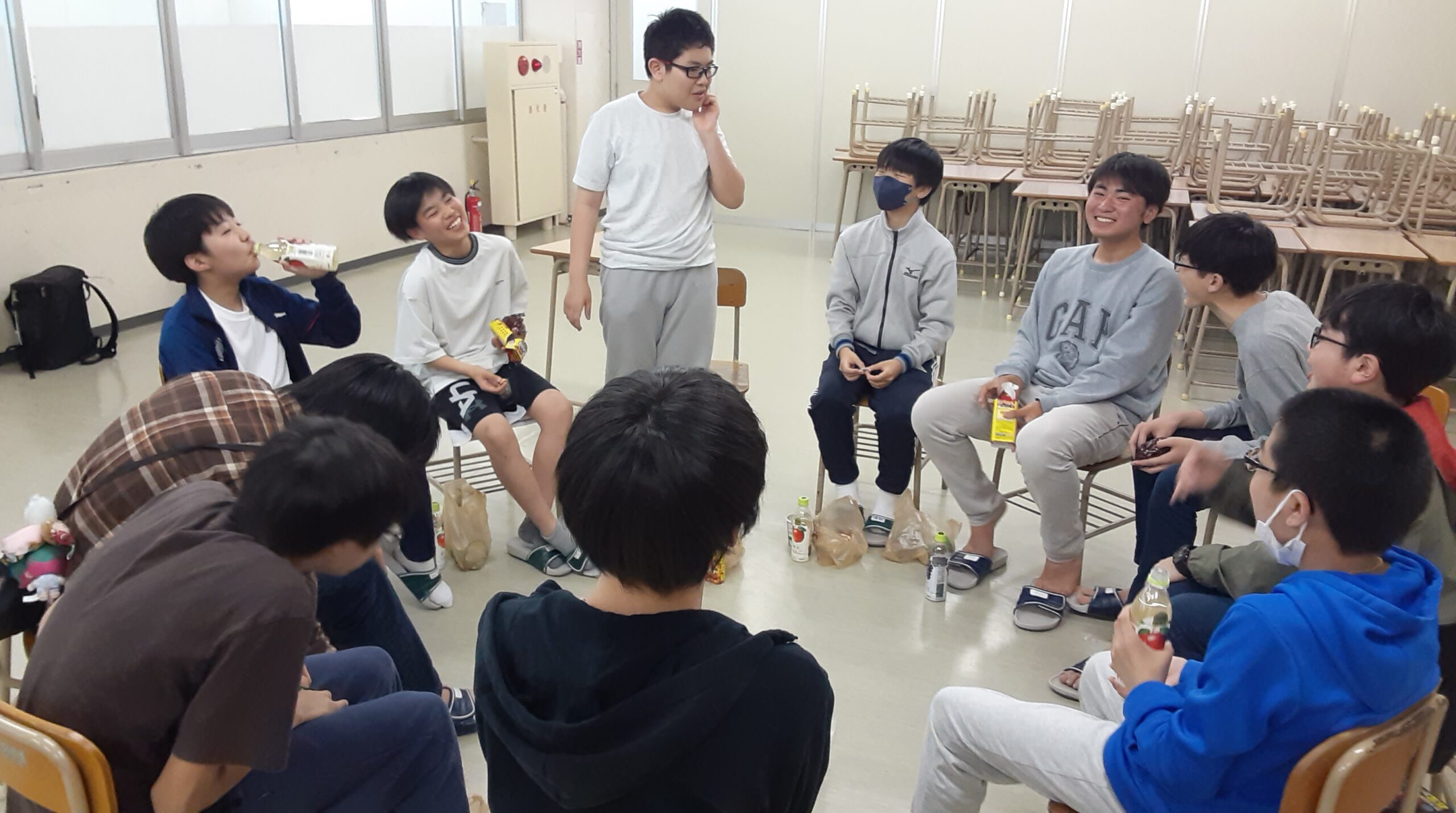 4月22日 中学2年生の責任者を中心に、出身地区毎に集まり、中学1年生の歓迎会を実施しました。 中学1年生と2年生の親睦が深まりました。