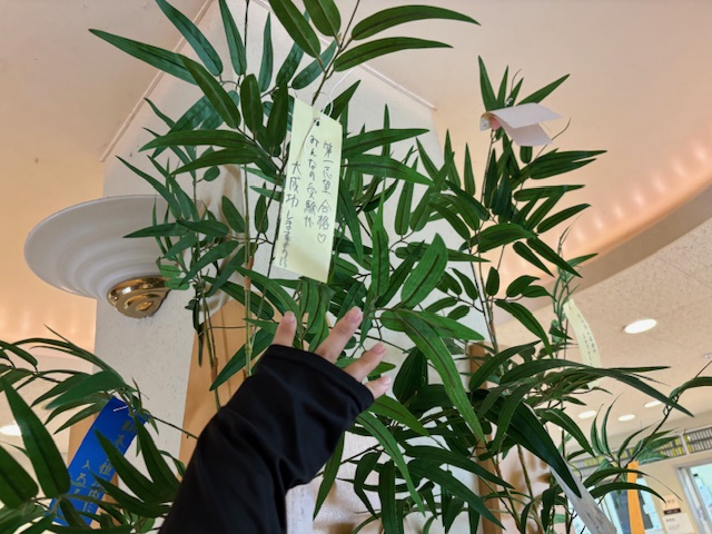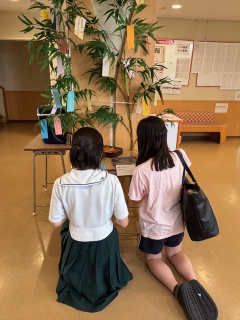 7月5日(土)学校から帰ってきた生徒たちが何の願い事を書こうか悩みながら、短冊にたくさんの願い事を書いていました。