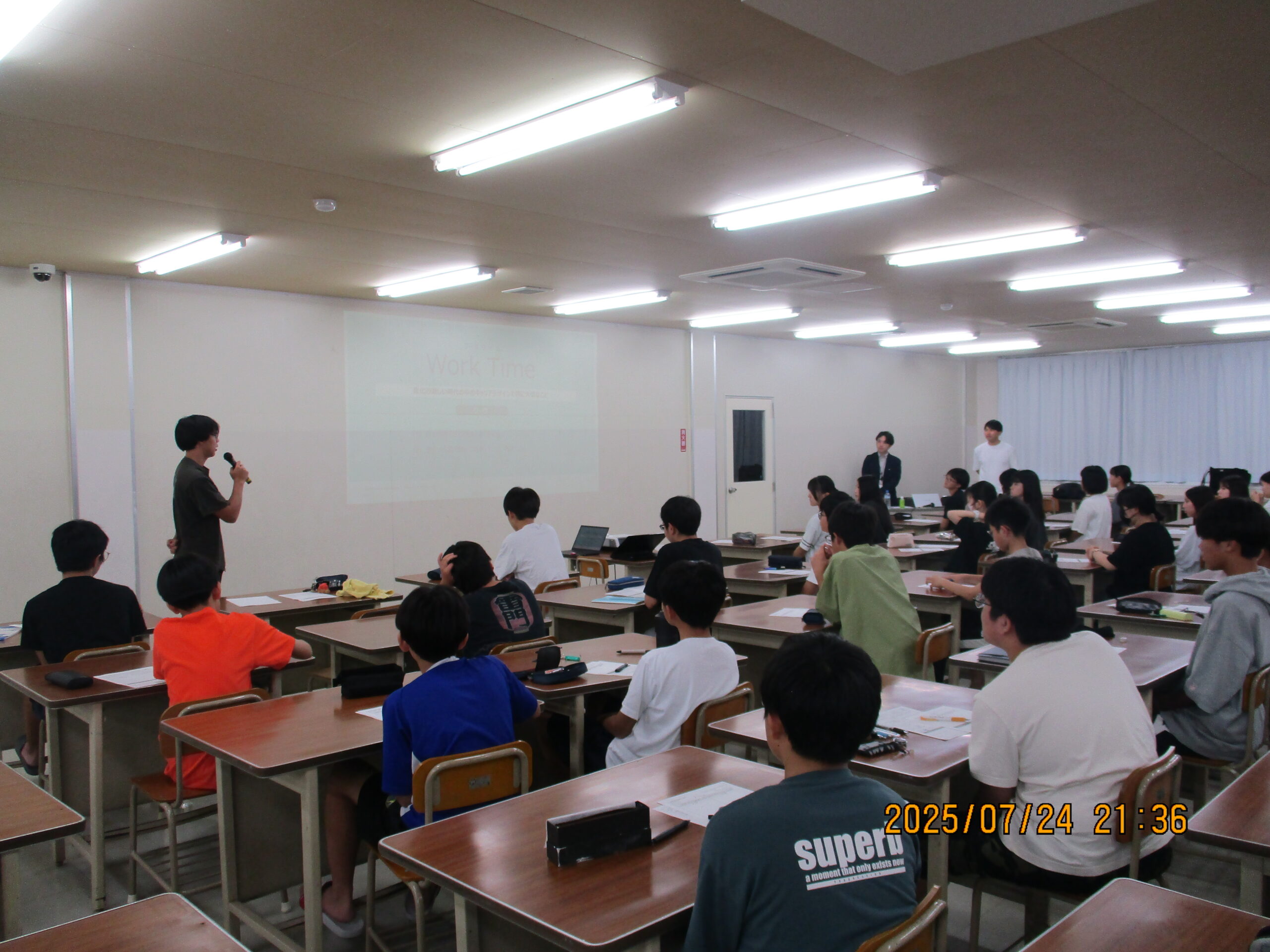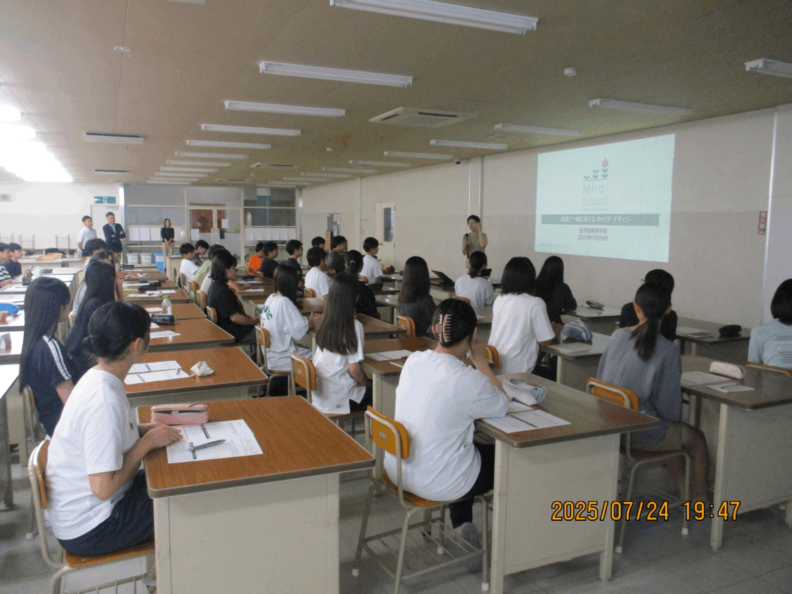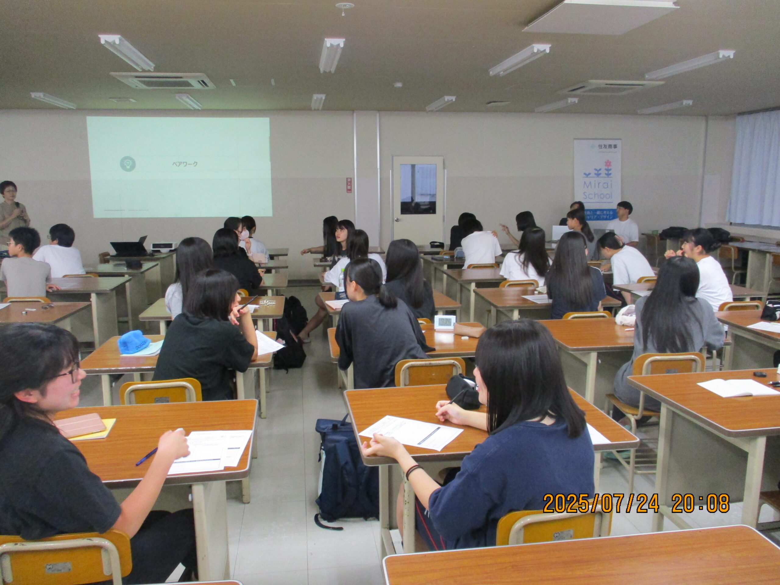 住友商事が主催する、Mirai School(キャリア教育支援)に参加希望を募ったところ、中・高校生の男女合わせて48名の申し込みがあり、7/24の学習時間を利用し、講師の先生を招きキャリアガイダンスを実施しました。講師の中には本校の卒業生もおり、寮生活の先輩として寮で学べたこと(人を観察する力が付いた、時には我慢をすること等々)が現在のキャリアに活かされていることや、また、他の講師の先生からは、将来に向けて、今、学んで欲しいことや経験してほしいこと、また、将来の進路について、働くことの意義等々の講話がありました。講話の後には生徒の方からの質問にも答えていただき、活気ある時間となりました。