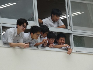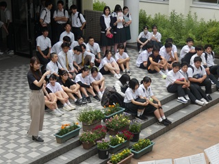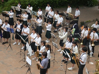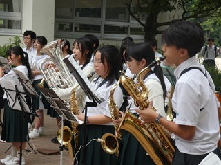 6月6日(金)、昨年に引き続き、吹奏楽部による中庭コンサートが開催されました。高校総体も終わり、これから受験勉強に向かう高校3年生を応援するために始まった企画です。爽やかな天候の中、元気の出る曲が奏でられ、多くの生徒が聞き入っていました。特に高校3年生にとっては、心地のよいファンファーレとなったようです。