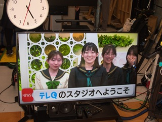 2月16日(日)に行われた「テレQアナウンスコンクール」アナウンス部門で銀賞を受賞した放送同好会,高校2年の村田琴美さんが3月28日(木)に放送された「テレQアナウンスコンクール」に学生キャスターとして生出演しました。本番前まで緊張で顔も強張り,ガチガチでしたが,本番は自然な笑顔でしっかりと原稿を読むことができました。放送の様子はYouTube(https://youtu.be/LChOThqGK6o?si=9heP1yxMNCpAA02z)でもご覧になることができます。