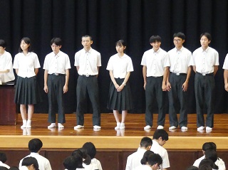 7月20日(土),1学期終業式が行われました。表彰式では県高校総体や中体連など様々な大会で活躍した選手が表彰されました。学校長からは,式辞の中で「生徒の学び方改革」と称し,授業を大切にすることや分からないときは先生を頼ることなど,学びに向かう姿勢についての話がありました。教務部,生徒指導部からは夏休みの学習時間や過ごし方についての話がありました。式終了後,県中体連やインターハイ,国スポを控えている選手たちの壮行会が行われ,選手たちは弘学館生としての誇りをもって高みを目指すことを熱く誓いました。また,7月26日(金)に開催される佐賀県吹奏楽コンクールに出場する吹奏楽部の壮行会も行われ,緊張感があり、心を打たれるような素晴らしい演奏が披露されました。