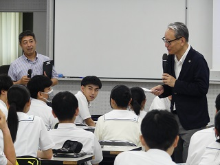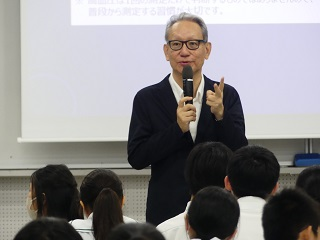 7月4日(木)に佐賀大学医学部長の野出孝一先生をお迎えして、中学1年生、高校1年生D・E組を対象に、血圧に関する講義が行われました。「血圧を知ろう(血圧に関する授業)」という演題で、生徒諸君は自身の健康と血圧の関係について理解を深めることができました。質疑応答では多くの生徒が質問を行い、中には高度な質問もあり、生徒達の興味・関心の高さをうかがえました。
